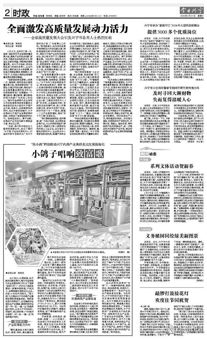 “省委省政府在新春上班第一天,高规格、强阵容举办高质量发展大会,我深深感受到广东要全力通过科技创新,推动各行各业高质量发展的担当作为。也深深感受到广东要建设一个靠创新进、靠创新强、靠创新胜的现代化新广东的信心和决心。”梅州市金绿现代农业有限公司总经理陈伟波是受邀到主会场参加此次大会的兴宁鸽产业代表,他表示,在深感荣幸的同时,也从中感受到梅州、兴宁在推动兴宁鸽产业发展获得的成效,并得到了省委省政府的认可。他将坚定信心、勇于创新,在推动产业科技创新中勇做奋斗者、争当主力军。