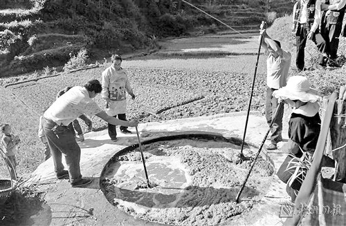 染布的原料叫靛青,也叫蓝靛。这是一种能提取染料的多年生草本植物,高约80厘米,有灰白色毛。靛青的种植同样粗放,在客家山村随处可种。靛青用来染布,颜色经久不退。所谓“青取之蓝而青于蓝”,说的就是靛青从草本到晶块、粉状的提炼过程。清康熙、雍正年间,闽西大量客家人迁至浙西南、湘赣边落叶开基,最原始的动力就是看中这里连绵不绝的低矮山丘可以大量种“菁”,以至于成为一种产业。据从上杭蛟洋华家迁至浙江遂昌的华氏后裔华贞隆写的《种靛招山客》一文,对从连城迁往遂昌的巫氏族人几代人开辟山场、大量种菁、提取蓝靛发财致富的过程有详细介绍,“农历立冬至小雪时节,是收割菁苗的季节。将菁苗连叶带秆五百斤左右一塘次,放水浸泡3至6昼夜,捞去浮渣。将石灰水舀入双耳木桶内,放入靛塘左右摇晃,使石灰水旋转式渗入大塘中。另三五人站在塘边用扁形六齿的靛青耙,不停地按、压、捅、打,使靛青水汁与石灰水产生化学反应,泛起浓浓的泡沫。搅动至靛青水变成蓝里透着红丝的色彩,用竹枝扑去泡沫,过夜沉淀。次日,捅开靛塘中部孔洞,放掉上层大半塘废水。下半塘较浓液体引入靛青池,用绢制卷筛一遍一遍筛去残渣,再沉淀。待池内靛青液浓缩至类似豆腐块,呈现黑里透着蓝色的胶质物,便是成品。”提炼后的靛青成晶块或粉状,便是上等染料。