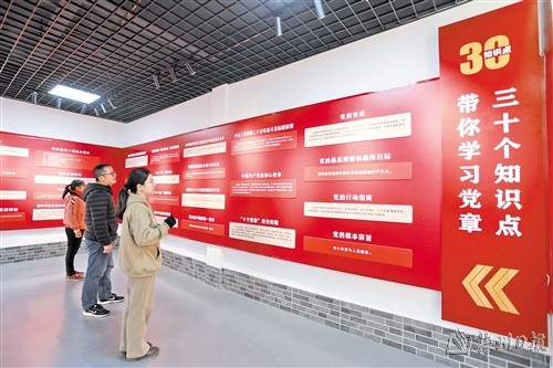 步入“党章学堂”,只见一盏硕大的党徽照明灯悬挂头顶,“讲好红色故事 让红色基因代代相传”的标语格外醒目,墙体上一一展示了大革命、土地革命时期入党誓词、解放战争时期及新中国成立前后入党誓词,一大党纲、二大党章、三大修正党章的通过情况、主要内容等,并配以图片加深观感,让参观者深刻了解中国共产党的光辉历程,更加珍惜来之不易的幸福生活。