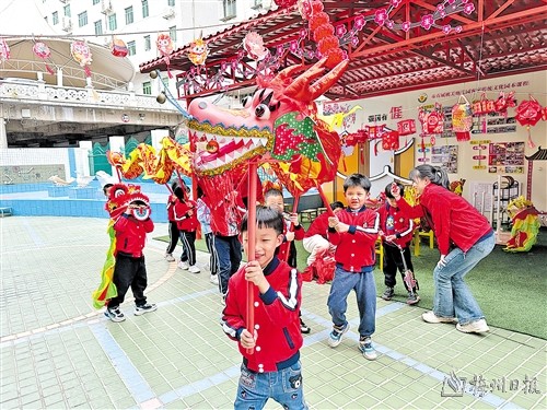 本报讯 2月23日,梅州市直属机关幼儿园锣鼓阵阵,热闹非凡。伴随着锣鼓声,高举着狮头、龙身的小朋友们排着队在空地上舞动起来(如上图),有的还不时眨眨眼睛、摆摆尾巴,与周围的孩子们互动嬉戏,现场一片欢声笑语。这是市直属机关幼儿园客家文化体验博物馆“闹元宵”活动现场的一幕。