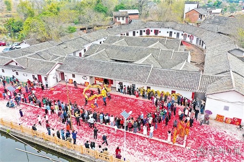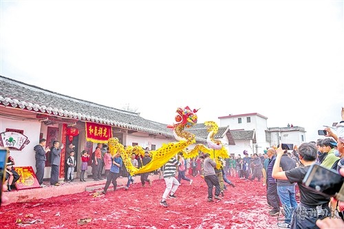 当花灯升上后,族人和亲朋好友围在围龙屋前,随着一阵“噼里啪啦”的鞭炮声响起,开始舞龙灯表演。让我印象最深的,就是舞龙灯的大部分都是年轻人,青年代表未来,留住年味,年轻人舞起了一条“青春龙”!他们扛起威风凛凛、祥瑞满满的“金龙”开始舞动起来,时而腾空跃起,时而俯冲直下,犹如真龙在空中飞舞,动人心魄,姿态万千。随着鼓声越来越急促,“龙”的动作也变得激烈起来。当龙头被抛起的那一刻,周围人的心都提到了嗓子眼。当龙头被稳稳接住时,人们都不约而同出了口大气。鼓掌声、欢呼声,连绵不断。听大家说,舞动的龙头,象征着新的开始;舞动的龙身,象征着无限的力量;舞动的龙尾,象征着成功的喜悦。