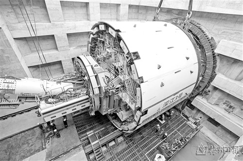 图为施工人员在吊装现场调整“鲲鹏号”盾构机的刀盘位置。