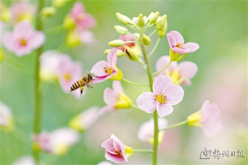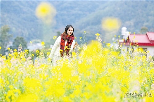 本报讯 (记者杨乔颖)满目金黄香,一方春色醉。日前,记者驱车沿着X045来到蕉岭县蓝坊镇高思村,这里120多亩梯田油菜花正盈盈盛开,花海与山峰、村落交相辉映,美不胜收。