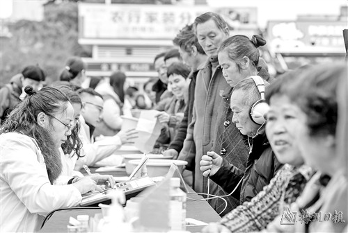 3月3日,医生在贵州省黔西市水西广场爱耳日主题宣传活动现场为群众检查听力。