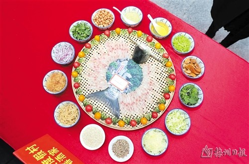 赛后,由鱼生技能竞赛获奖单位共同制作400围五华鱼生美食大宴会,即一筛鱼生、一瓶长乐烧、一锅长乐菩米鱼头粥供广大球迷、市民品尝和销售,五湖四海的球迷游客齐聚一堂,共享美食盛会。一口鱼生,体验白醋的微酸、腌蒜的咸香、薄荷叶的香气,各种配料和味道互相渗透,让人感觉层次分明、滋味丰富,新鲜食材中迸发出酸甜香辣的味道。