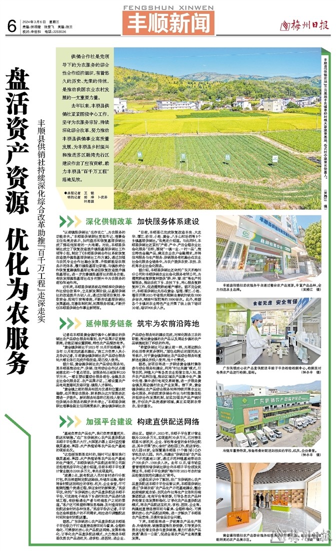 记者在采访中了解到,自广东供销放心农产品直供配送丰顺子平台运营以来,丰顺县供销社通过“供销农场”农产品生产示范基地建设,整合起前端家庭农场、农民合作社等生产主体和后端集团配送、电商平台等资源,引导各类农产品种养经营主体发展标准化、订单化农产品直供配送模式,将农产品配送至机关、学校、医院、企业等,构建起直接连接田间与餐桌、全程标准化、可溯源的放心农产品配送网络,进一步解决了丰顺县农产品卖难、买贵和食品安全问题。