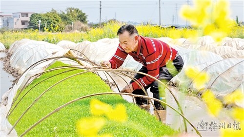 3月5日上午,记者来到兴宁市叶塘镇麻岭村,只见一粒粒冒着白芽的稻种均匀地平铺在田中,村民们正忙着给秧苗覆盖薄膜。“为了给晚稻预留出足够的耕种时间,我们今年从年初五就开始浸种,第一批秧苗已经长到七八厘米高,15天后就可以开始插秧了。”兴宁市绿达种养合作社负责人罗伟超说。据介绍,今春该合作社预计播种水稻面积近2000亩,比去年增加约300亩,主要种植丝苗米。“春节过后,麻岭村干部提早组织人员对稻田附近的水利基础设施进行开沟引水,为我们春耕生产创造了良好的条件。我们分五个批次进行育秧,目前已基本完成春播的育秧工作。”罗伟超告诉记者,当前,该合作社正在建设育秧中心,今后可为附近村民提供“订单式”育秧服务。