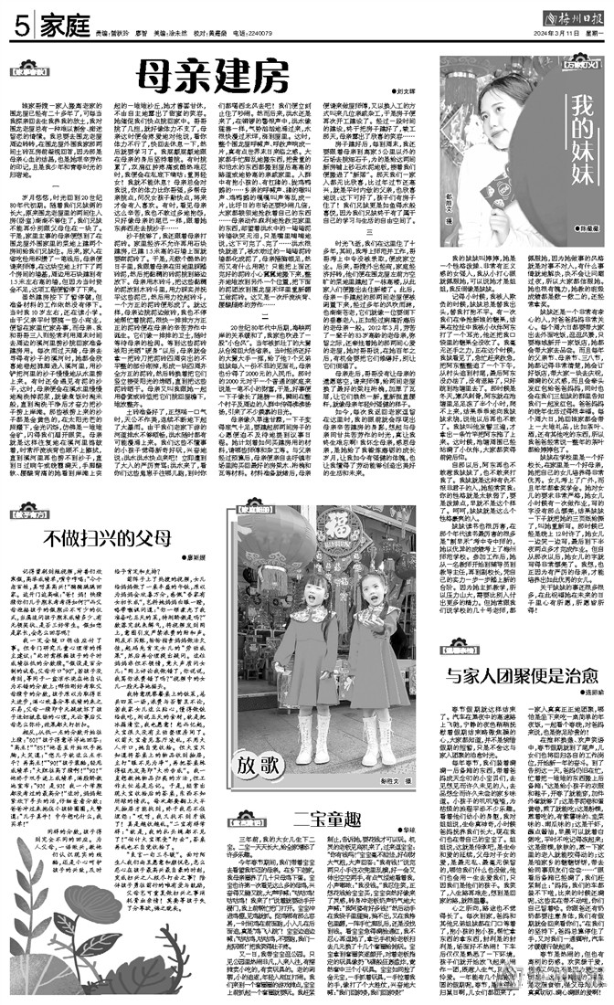 母亲像久旱逢甘霖,一下子变得底气十足,要建起那两间房子的心愿便迫不及待地提到议事日程。她计划着如何买建房用的材料,请哪些师傅和杂工等。与父亲经过预算后,母亲便亲自去圩镇市场里购买回最好的房梁木、桁桷和瓦等材料。材料准备就绪后,母亲便请来做屋师傅,又以换人工的方式叫来几位亲戚杂工,于是房子便再次开工建设了。经过一段时间的建设,终于把房子建好了,竣工那天,母亲露出了欣喜的笑容……