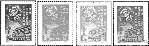 该套邮票的选题设计工作早在1949年夏季便已开始,邮票发行部门请当时正在中南海参加中国人民政治协商会议和开国大典美术布局的张仃和钟灵两位同志进行设计。并根据邓连普先生的建议,在邮票下方开始标记使用志号,这也是世界邮票史上的一项创举。全套4枚邮票(图①为其中之一)图案均相同,颜色分别为蓝、红、翠绿和紫色。邮票图案左上方是一盏象征喜庆的宫灯,宫灯中央是中国人民政治协商会议会徽。会徽图案以光芒四射的蓝天为背景,中心是五角星、四面旗帜和中国地图,周围是缎带连接的齿轮和麦穗。邮票图案的右下方是天安门,左边是华表,天安门前是接受检阅的队伍,天安门上空有人民空军的飞机,图案最下边面值框之间是“中华人民邮政”文字。该套邮票面值分别为旧币30元、50元、100元和200元。由于新中国成立之初至1951年年初,东北三省流通的东北币,尚未以人民币收兑。因此,在这段时间内,发行全国通用邮票的同时,另发行同图东北币值邮票,并印有“东北贴用”字样,限东北地区贴用。该套邮票后于1955年1月10日再版发行,再版邮票区别为:灯笼下方花纹右边第一个花球,原版被断裂,再版是完整的。
