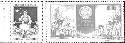 首套人大专题邮票 为纪念第一届全国人民代表大会在北京召开,原邮电部于1954年12月30日发行了纪29《中华人民共和国第一届全国人民代表大会》纪念邮票一套2枚。其中第一枚邮票(如图②)图案为“普选”(2-1),展示的是基层选举的场面。画面中一个穿着工装的女工正在往票箱中投选票,背景是中华人民共和国国旗;第二枚邮票(如图③)图案为 “庆祝全国人民代表大会”(2-2),展示的是各族人民庆祝第一届全国人民代表大会召开的情景,画面中央为中华人民共和国国徽,两边是庆祝的人群。设计者特意采用了红色作为整枚邮票的基本色调,以衬托出热烈的气氛。