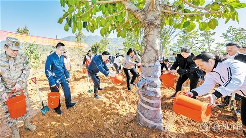 春光融融,青山苍翠。在兴宁市黄槐镇四望嶂广东省特色文旅研学基地项目现场义务植树点,大家热情高涨、干劲十足,挥锹铲土、培实新土、提桶浇水,接连种下了红锥、火力楠、土沉香、木荷、闽楠等乔木约2100株。据悉,今年义务植树主题为“全面推进乡村绿化,建设美丽宜居广东”。当天,全省五级林长同步开展义务植树活动,梅州积极响应绿美广东生态建设的号召,全市市、县、镇、村四级林长共同参与。