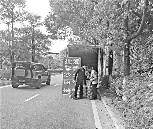 根据报料线索,记者来到梅江区泮坑大道,发现有流动摊贩将货车停放在道路一侧,打开车厢门,就地摆起了柚子摊。其车内载有不少已打包装好的柚子,车旁放置了一块写有“批发零售沙田柚、三红柚”字样的大牌子,不时有路过车主将车辆停放在路边,走下车来询问或购买(如图,朱绮辉摄)。“平时有不少市民途经此处前往泮坑风景区休闲游玩,周末、节假日还有外地游客前来,摊贩选择在这里售卖客家特产柚子,可能是觉得会比在别处做生意更好。”报料市民说。记者留意到,该摊主所在的道路一侧原本为单向两车道,柚子销售点违规占用机动车道,压缩了车辆通行路面面积,不仅影响道路正常交通秩序,容易引发交通事故,也给摊主自身安全带来隐患。