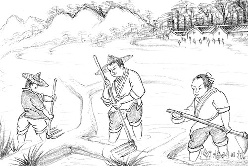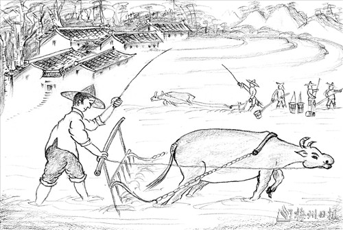 点评:说了读书,再说农事。春耕夏种,尊崇自然。作陂开圳引水,准备秧地育秧。融田耙田打基肥,指望今年好收成。“打落脚”,即为稻田下基肥。