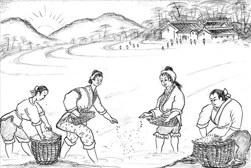 点评:进入农历二月,就到了惊蛰节气。“懵懵懂懂,惊蛰浸种”,此时,农人要浸谷种,待谷种生芽后,撒在秧畦里育秧。约35天后,即可以脱秧、插秧。有的农人不再育秧,而是直接把谷种整齐地播撒在田里,任其生长。“揋”客家话,撒的意思。“掂谷子”:把谷种横直对齐直播在田里,不需育秧、脱秧、插秧。