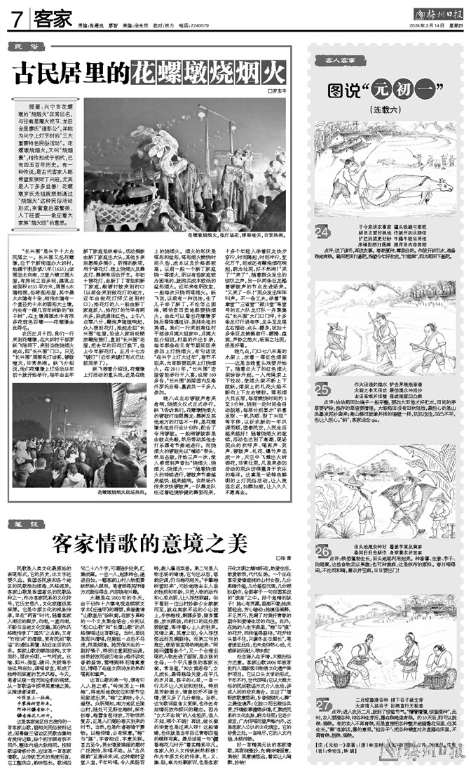 处世诲人在乎情,大雅归俗方达意。客家山歌2006年被首批列入国家级非物质文化遗产保护项目。它以口头文学的形式,千年不朽,世代颂唱;它以大雅大俗的民间歌谣方式介入生活,讲述人间的悲欢离合。正应了“清野放歌意悠闲,乡音绕绕沁心脾”之最佳境界;它脱口而出雅俗共赏,抒情叙事缠绵多情,汇聚成民系的文化血脉,蔚为壮观;它老少咸宜,广为传唱而蜚声海内外,这是客家人公认的文化瑰宝。它的珍贵之处,一言难尽,它的人文内涵,永续传扬。
