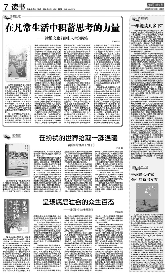 《星空与半棵树》的立意是埋头走路,路难行时,不妨抬头看看天。其实,无论是安北斗还是温如风,他们都不过是社会中的微小粒子,他们所面对的生活困境看似不过是一地鸡毛,而细水微澜中却翻滚着基层社会的新鲜血液。小说借此展示出植根于传统文化的经验和智慧。毫无疑问,《星空与半棵树》呈现出底层社会的众生百态,它不是任何一位具体人物的英雄颂诗,它是属于每一位择善固执、真诚活着的普通人命运交响曲。