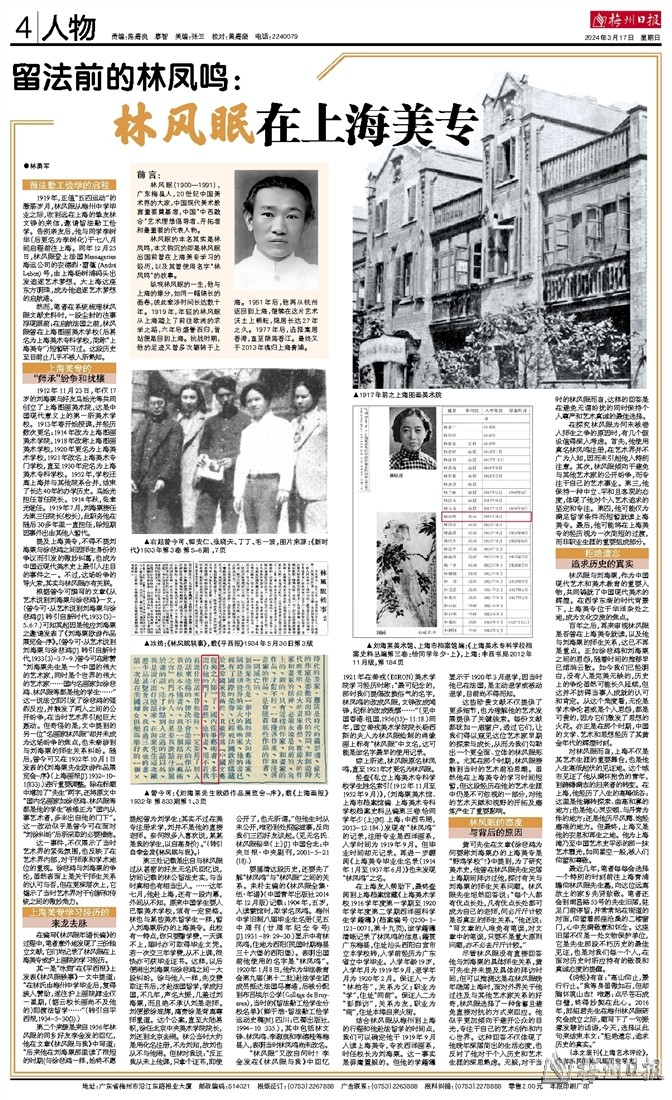 其一是“冰筠”在《平西报》上发表《林风眠轶事》一文中提道:“在林氏由梅州中学毕业后,复得族人赞助,遂往沪上画院肄业仅一星期,(据云校长画尚不及他的)即渡法留学……”(转引自平西报,1934-5-30(3).)