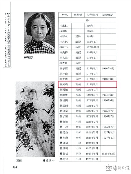 经查《私立上海美术专科学校学生姓名索引(1912年11月至1952年9月)》,(刘海粟美术馆、上海市档案馆编.上海美术专科学校档案史料丛编第三卷:恰同学年少(上)[M].上海:中西书局,2013-12:184.)发现有“林凤鸣”的记录,注册专业是西洋画系,入学时间为1919年9月。但毕业时间却无记录。再进一步翻阅《上海美专毕业生名录(1914年1月至1937年6月)》也未发现“林凤鸣”之名。