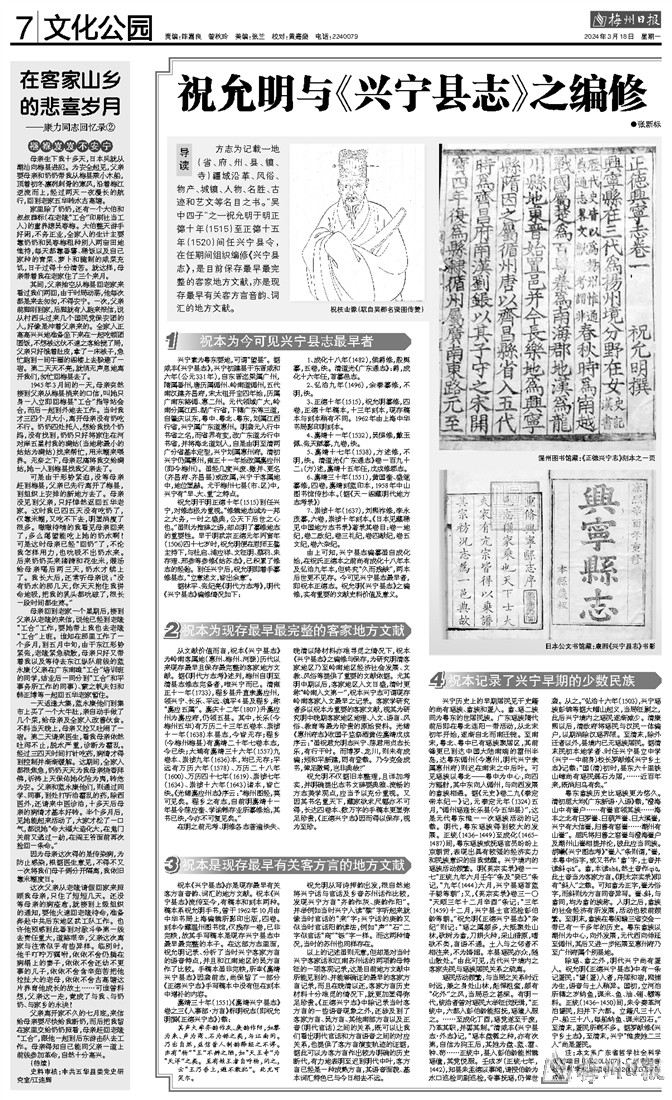 方志为记载一地(省、府、州、县、镇、寺)疆域沿革、风俗、物产、城镇、人物、名胜、古迹和艺文等名目之书。“吴中四子”之一祝允明于明正德十年(1515)至正德十五年(1520)间任兴宁县令,在任期间组织编修《兴宁县志》,是目前保存最早最完整的客家地方文献,亦是现存最早有关客方言音韵、词汇的地方文献。