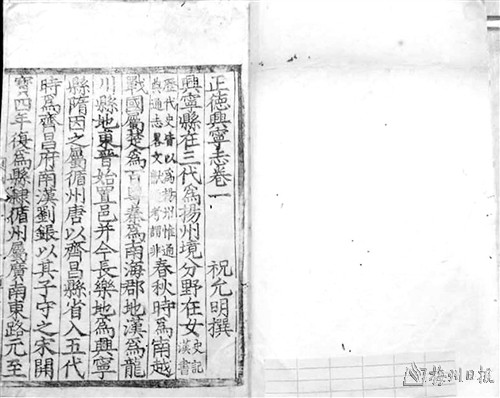 祝允明于明正德十年(1515)到任兴宁,对修志极为重视。“修辑地志诚为一邦之大务,一时之盛典,公天下后世之心也。”虽则为推辞之语,却点明了纂修地志的重要性。早于明武宗正德元年丙寅年(1506)四十七岁时,祝允明便在恩师王鏊主持下,与杜启、浦应祥、文征明、蔡羽、朱存理、邢参等参修《姑苏志》,已积累了修志的经验。到任兴宁后,祝允明即着手纂修县志,“立意述文,皆出余意”。