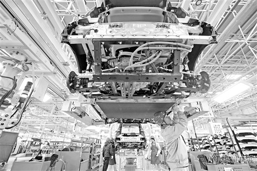 3月19日,奇瑞新能源汽车股份有限公司石家庄分公司的工人在总装车间生产线上工作。