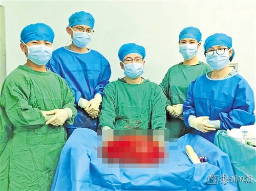 本报讯 今年45岁的患者李叔,近一年来经常感到腹胀,且“肚腩”也是越来越大,近期更是腹胀得难受,于是便到中山大学附属第三医院粤东医院(以下简称:粤东医院)胃肠外科就诊。医生对李叔进行腹部磁共振检查,结果提示李叔腹盆腔有巨大肿物,大小约35×29×15cm,可能是间叶源性肿瘤性病变(脂肪肉瘤)。