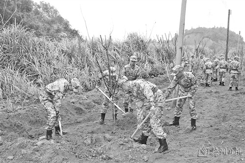本报讯 为积极响应丰顺县委、县政府“百千万工程”和“绿美丰顺”生态建设号召,3月14日,丰顺县人武部组织机关全体人员、民兵分队、即将入伍的新兵共100余人开展义务植树活动,为绿美丰顺贡献武装力量。丰顺县委常委、人武部领导罗小平,县人武部领导罗晓明参加活动。