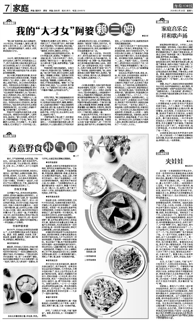 阿婆是村里出了名的勤劳扎实人,阿公病故时,阿婆才40岁,此后承担了更多的农活。为了种好作物,经常挑粪肥田,哪怕是远在二三里外的田,都坚持挑担过去。我们说好臭,她说:“没有屎尿臭,哪来稻米香。”夏收夏种时,阿婆是最忙的人,也是最能干的人。三个儿子、一个女儿共四家收割稻子,她都要去帮忙。记得她70多岁了,还能挑起100多斤的稻谷,特别是下雨天抢收稻子,她挑担走路脚下生风似的,一些年轻人都赶不上。我爸妈等人经常劝她要多休息,毕竟年纪大了。但无论怎么劝,她还是坚持天天到地里种菜、田里除草、山上砍柴……曾经两次跌倒在野猪坑里。自跌倒后,她的身体就差很多,病越来越重,于2001年去世。举行悼念仪式时,全村家家户户都来人参加,都说赖三姆的去世,就是村里损失了一个大好人、大才女。