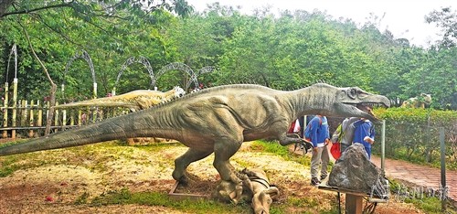 然而无论是海洋世界,还是浪漫的玫瑰园,都不入小朋友眼,吸引他们的却是景区内的恐龙世界。在“我要去看恐龙”的吆喝声中,我们走进恐龙世界。只见有“长达十八米”的霸王龙,威风凛凛、霸气十足,不仅模样逼真,声音还活灵活现。除此外还有腕龙、三角龙、慈姆龙、双冠龙、迅猛龙、剑龙等各式各样不同种类的恐龙,置身其中好似有重返侏罗纪世界的幻觉。元和南两个小朋友亲眼看见会动、会叫、会眨眼、各式各样精致恐龙总动员,既兴奋又吓得哇哇大叫,看完恐龙,小朋友们跑进沙池,美其名曰寻找恐龙化石,与大自然来一个亲密接触。