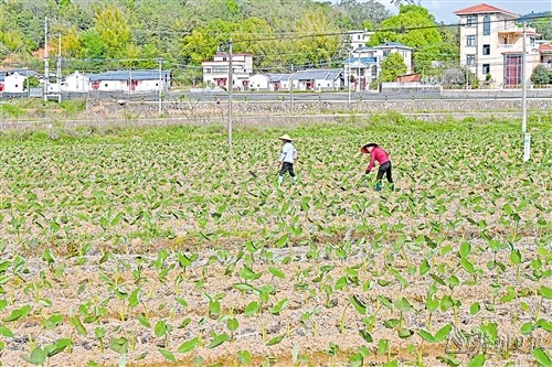 走进长田镇长安村,目之所及,一眼望不到边的深绿,恰是槟榔芋拔高成长的主打色。种植户涂宣樟正在阳光下背着肥料到田地里,来自福建省长汀县的他种植槟榔芋已有10多年,“我在这边通过土地流转承包了100多亩来种芋头,现在长势还可以,农历6月底就可以采收了。”涂宣樟表示。
