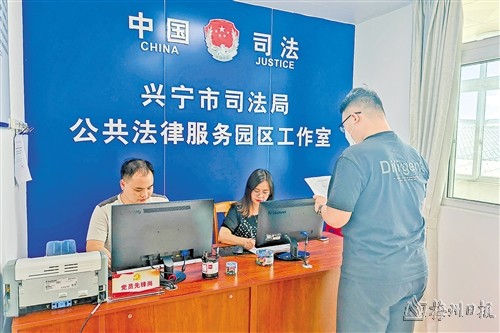 在兴宁市产业转移工业园,兴宁市司法局设立的公共法律服务园区工作室、律师慧企工作点,通过统筹整合律师、人民调解、行政复议、法律援助、普法宣传等专业法律服务资源,探索“党建+公共法律服务”方式。其采用“0137”服务模式(即简单问题当场解答,紧急事件1天内答复,疑难问题3个工作日解答,需调研的法律问题7个工作日回复),打通服务企业“最后一公里”。自去年7月成立以来,累计为企业员工提供法律咨询60人次,进一步推动提升了园区治理和企业经营管理法治化水平,大力营造法治化营商环境。