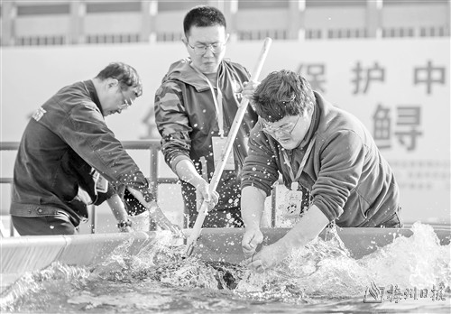 3月28日,工作人员给中华鲟植入声呐标记。