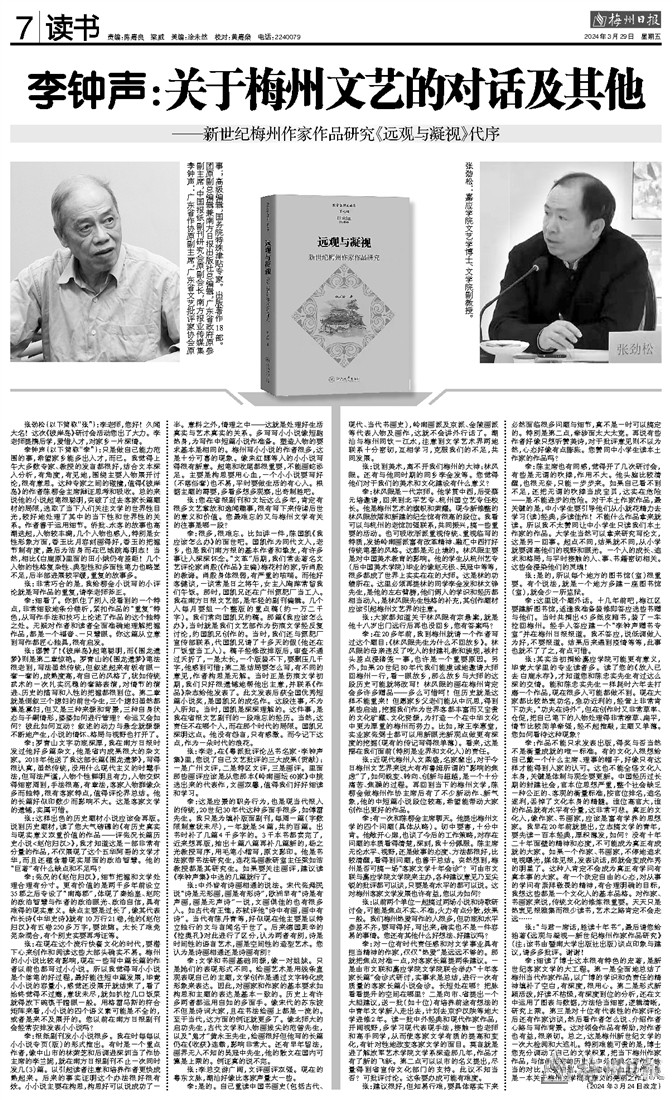 张:“与君一席话,胜读十年书”,最后请您给拙著《远观与凝视—新世纪梅州作家作品研究》(注:该书由暨南大学出版社出版)谈点印象与建议,请多多批评。谢谢!