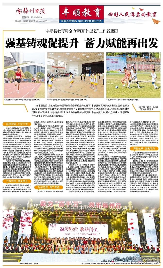 强基铸魂促提升,蓄力赋能再出发。丰顺县教育局以党建工作为引领,深化课程育人,以精细化管理为主抓手,夯实义务教育基础,深化体卫艺教育改革,强化内涵提升。将体卫艺教育与人文素养、身体素质、健康生活等要素融合起来,提升智育水平,为“双减”固本,着力提质增效,主动创新工作举措,优化实践路径,谱写优质均衡的丰顺教育新篇章。