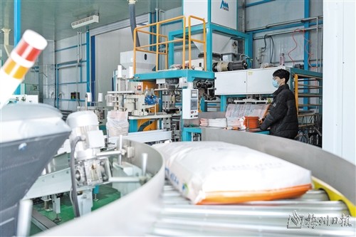 3月29日,在黑河五大连池市一家农业科技有限公司,工作人员在车间内包装大豆种子。