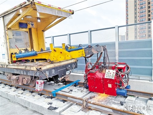 目前,梅龙高铁铺轨施工正如火如荼地进行,焊轨作业成为影响工期的关键工序。为确保尽早打开焊轨施工作业面,项目部提前统筹规划,不断优化铺轨方案,充分利用公司研发的国内首台智能化、多功能本邻线长轨铺设机组的“双线双铺”智能功能,精准调整铺轨顺序,为焊轨提前施工提供了有利条件。作业现场,每个岗位上的人员各司其职、紧凑有序地开展各项工作,作业人员熟练谨慎地开展轨端除锈、焊接推瘤、正火、精磨、探伤等十几道工序作业。
