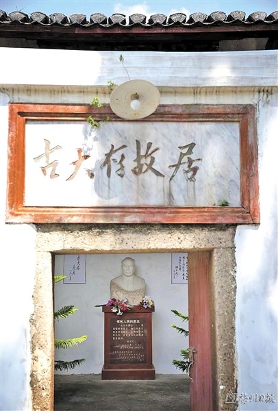 我们一行从梅城出发,驱车前往五华县梅林镇优河村古大存故居。视觉下的优河村是个美丽而静谧的小村庄,当汽车抵达古大存故居的门坪时,映入眼帘的是枝繁叶茂,高大挺拔的两棵木棉。这是一座朴素无华的古民居,没有翘角的重檐,没有雕梁画栋的装饰,与四周围的建筑相比,显得异常的平淡和无奇。然而,就是这个朴素的民居,却享有“一门忠烈”的殊荣。