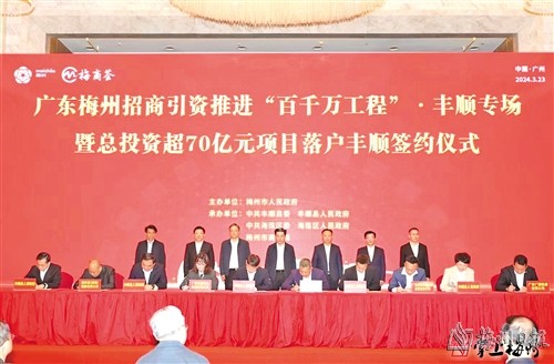 本报讯 近日,广东梅州招商引资推进“百千万工程”·丰顺专场暨总投资超70亿元项目落户丰顺签约仪式在广州市珠江国际酒店举行,现场共签约项目11个、总投资71.81亿元(如图)。梅州市委副书记、市长王晖出席并致辞。