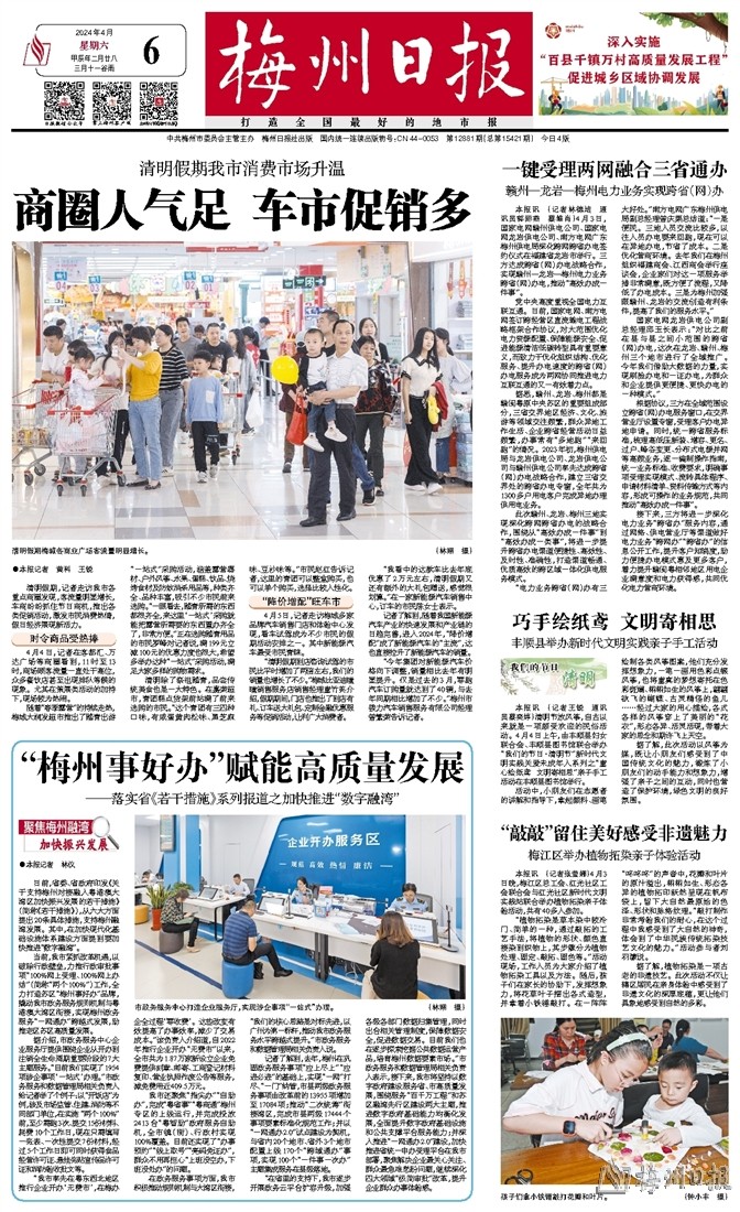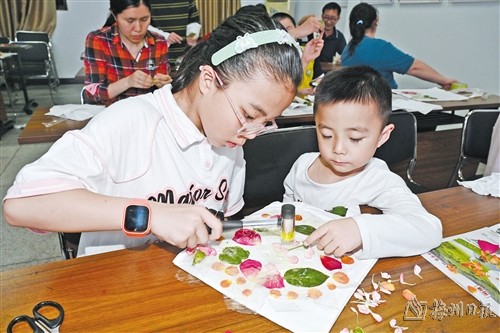 本报讯 (记者张莹娜)4月3日晚,梅江区总工会、红光社区工会联合会与红光社区新时代文明实践站联合举办植物拓染亲子体验活动,共有40多人参加。