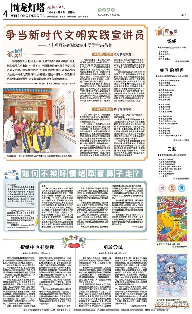 邮寄地址:梅州市沿江东路梅州日报社教育周刊编辑部知心姐姐栏目(收)。