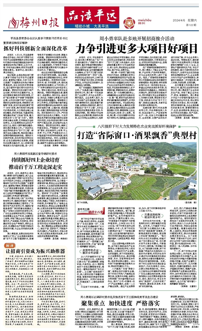 排下村位于梅州市平远县八尺镇,毗邻江西寻乌,此地既是“广东东江源第一村”,又是粤东北地区连通赣南的“北大门”。自“百千万工程”开展以来,排下村抢抓发展机遇,立足自身资源禀赋,坚持党建引领基层治理、联动发展旅游产业、大力发展特色农业、突出抓好环境保护,以“一园两圈三地”总体规划布局,打造“省际窗口·酒果飘香”典型村。