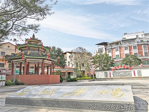 走过凌风东路,来到元城广场。元城广场为纪念开启梅州文教之风的北宋名臣刘元城而命名。广场内设置有地面浮雕和墙面浮雕,以现有梅江区历史文化街区路网系统为背景,融入清代嘉应州州署布局图,呈现了老城街区的古今风韵。广场的北上角有座“八角亭”。亭高10米,形呈八角,内外两围各8根红柱,擎顶着3层亭顶,顶盖琉璃绿瓦,大门楼及亭梁上有“八仙过海”“龙凤呈祥”等浮塑,工艺精巧,造型美观。1925年,广东革命政府东征军两次抵梅后,八角亭为新学生社办事处和中共梅县党团活动的地方,成为当时革命活动中心。