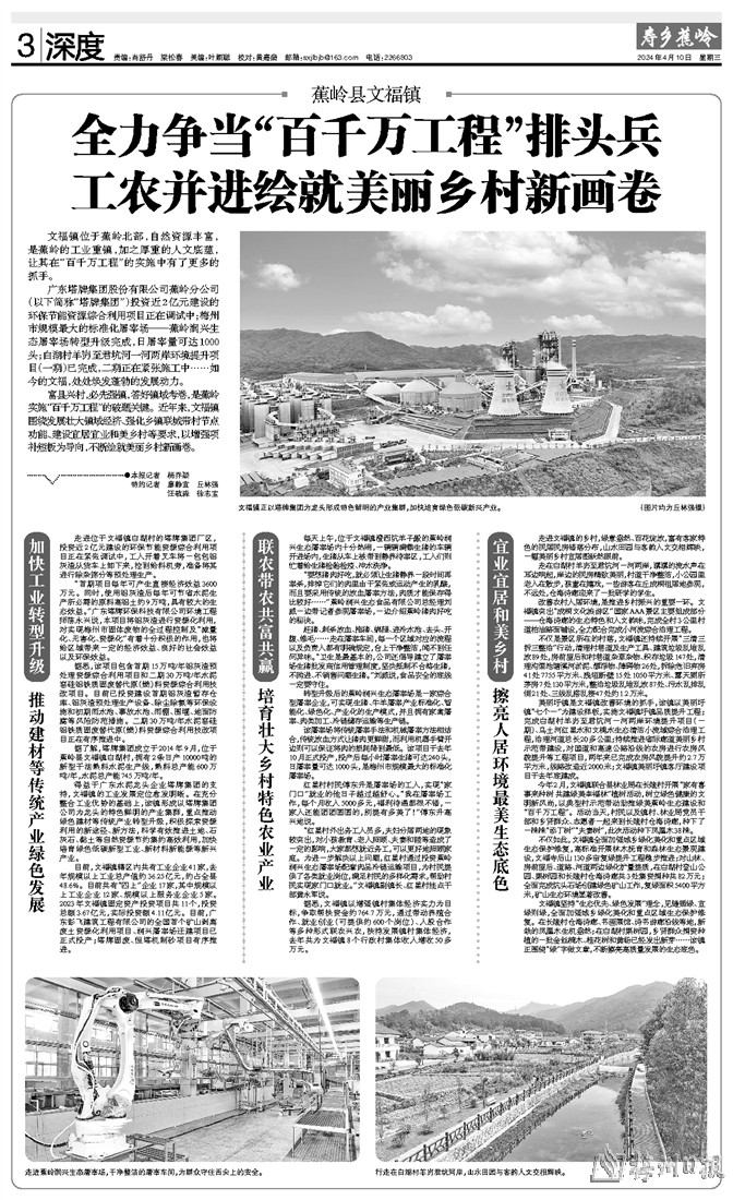 广东塔牌集团股份有限公司蕉岭分公司(以下简称“塔牌集团”)投资近2亿元建设的环保节能资源综合利用项目正在调试中;梅州市规模最大的标准化屠宰场——蕉岭润兴生态屠宰场转型升级完成,日屠宰量可达1000头;白湖村羊岃至君坑河一河两岸环境提升项目(一期)已完成,二期正在紧张施工中……如今的文福,处处焕发蓬勃的发展动力。