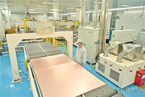 走进平远高新区的广东盈华电子材料有限公司(下称“盈华材料”)高性能覆铜板项目二期厂房内部,偌大的生产车间宽敞明亮、干净整洁,工作人员对回流裁切线和叠合区的设备进行着联机调试,一张张堆叠好的覆铜板通过自动小车运送到下一步工序机器上。