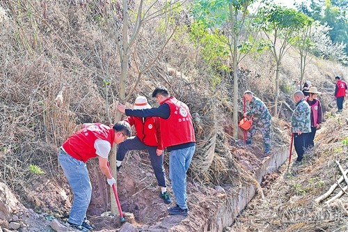 长田镇长田村国道连接高速路口的植树现场,一派繁忙。该镇党员干部、群众、返乡大学生志愿者等70多人一起挥锹铲土、培土围堰、提水浇灌,认真细致、干劲十足种下一棵棵树苗。