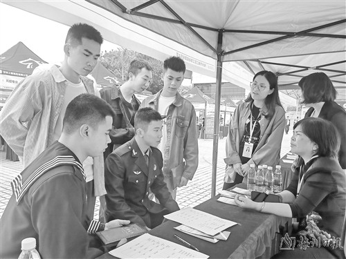 本报讯 (记者郑炜梅)4月11日上午,梅州市2024年退役军人暨军嫂招聘会在梅城剑英体育馆广场举行,65家企业提供2000多个岗位供应聘者选择。招聘会期间,吸引了众多退役军人、军属、群众前来咨询、投递简历。