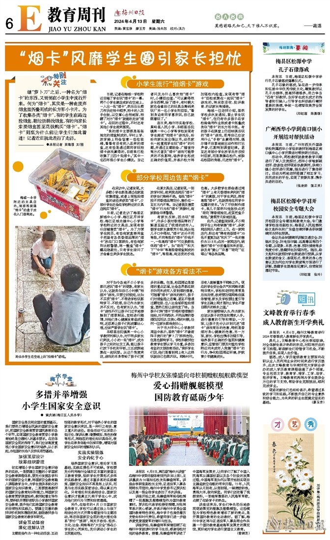 连日来,梅州市实验学校、蕉岭县人民小学、丰顺县汤坑镇第一中心小学等学校发现有学生痴迷“拍烟卡”游戏后,纷纷向家长发出倡议书,动员家长一起重视学生玩“烟卡”的问题,并通过主题班会、广播宣传等方式普及“烟卡”游戏可能带来的不良影响,培养学生形成正确的价值观,并表示校方将加强校内检查,发现有带“烟卡”回校或聚在一起玩“烟卡”游戏的,将采取没收、批评教育、约谈家长等措施。