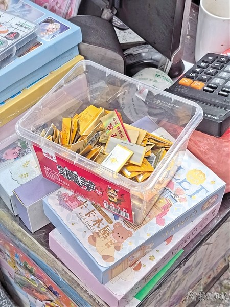日前,记者走访了梅县区新城中心小学、梅江区芹洋学校、梅江区城北镇中心小学等学校附近的文具店,发现有部分店铺售卖“烟卡”。为了方便学生购买,有些商家直接用盒子把装有各类香烟品牌的“烟卡”放在门口显眼处,有些商家则比较警惕,将一整盒“烟卡”藏在隐蔽处,只有学生询问了才会拿出来供学生挑选。