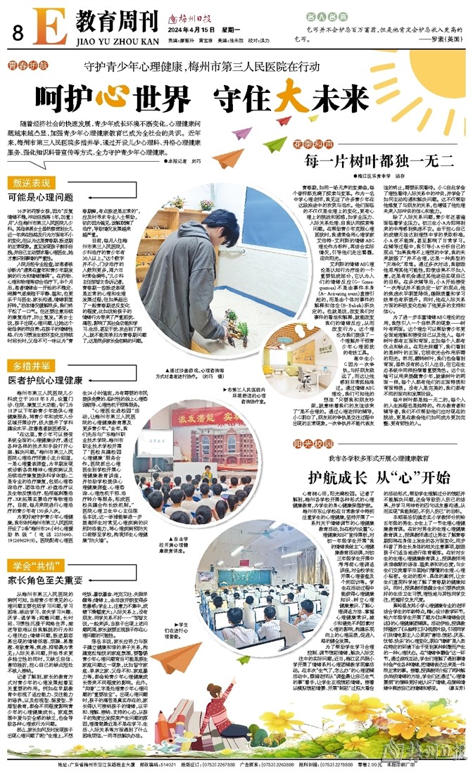 随着经济社会的快速发展,青少年成长环境不断变化,心理健康问题越来越凸显,加强青少年心理健康教育已成为全社会的共识。近年来,梅州市第三人民医院多措并举,通过开设儿少心理科、升格心理健康服务、强化知识科普宣传等方式,全力守护青少年心理健康。