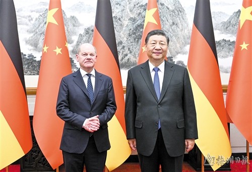 习近平指出,中德产业链供应链深度互嵌,两国市场高度依存。中德互利合作不是“风险”,而是双方关系稳定的保障、开创未来的机遇。无论是机械制造、汽车等传统领域,还是绿色转型、数字化、人工智能等新兴领域,两国都有合作共赢的巨大潜力亟待挖掘。双方应该发扬互利共赢的鲜明特色,彼此成就。中国出口电动汽车、锂电池、光伏产品等,不仅丰富了全球供给,缓解了全球通胀压力,也为全球应对气候变化和绿色低碳转型作出巨大贡献。中德两国都是以实业立国,都支持自由贸易和经济全球化。双方要警惕保护主义抬头,坚持以市场眼光和全球视野,从经济规律出发,客观、辩证看待产能问题,多探讨合作。中国坚持对外开放基本国策,希望德方为中国企业赴德发展提供公平、透明、开放、非歧视的营商环境。中德在世界多极化问题上有不少共通之处。多极化本质上应该是不同文明、不同制度、不同道路的国家之间相互尊重、和平共处。中德应该独立自主开展多边领域协作,推动国际社会用实际行动更好应对气候变化、发展不平衡、地区冲突等全球性挑战,为世界的平衡稳定作出更多贡献。